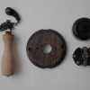 ハンドルはオークの古材で製作。フォルムは古いぽってりとした陶器製プルハンドルをイメージしました。